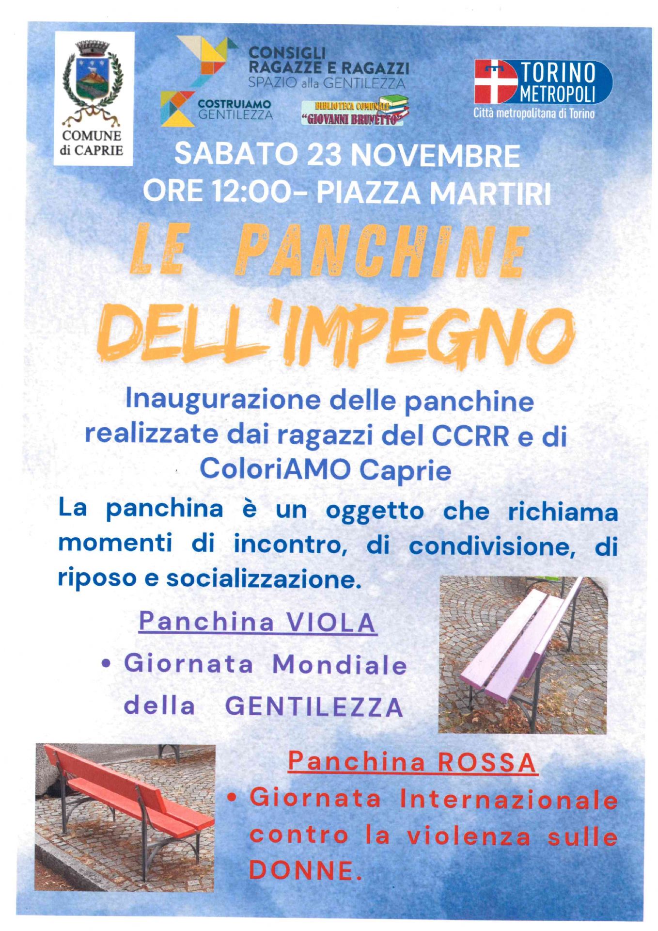 13 Novembre Giornata Mondiale della GENTILEZZA e 25 novembre Giornata Internazionale per l'eliminazione della violenza sulle DONNE - Le Panchine dell'Impegno