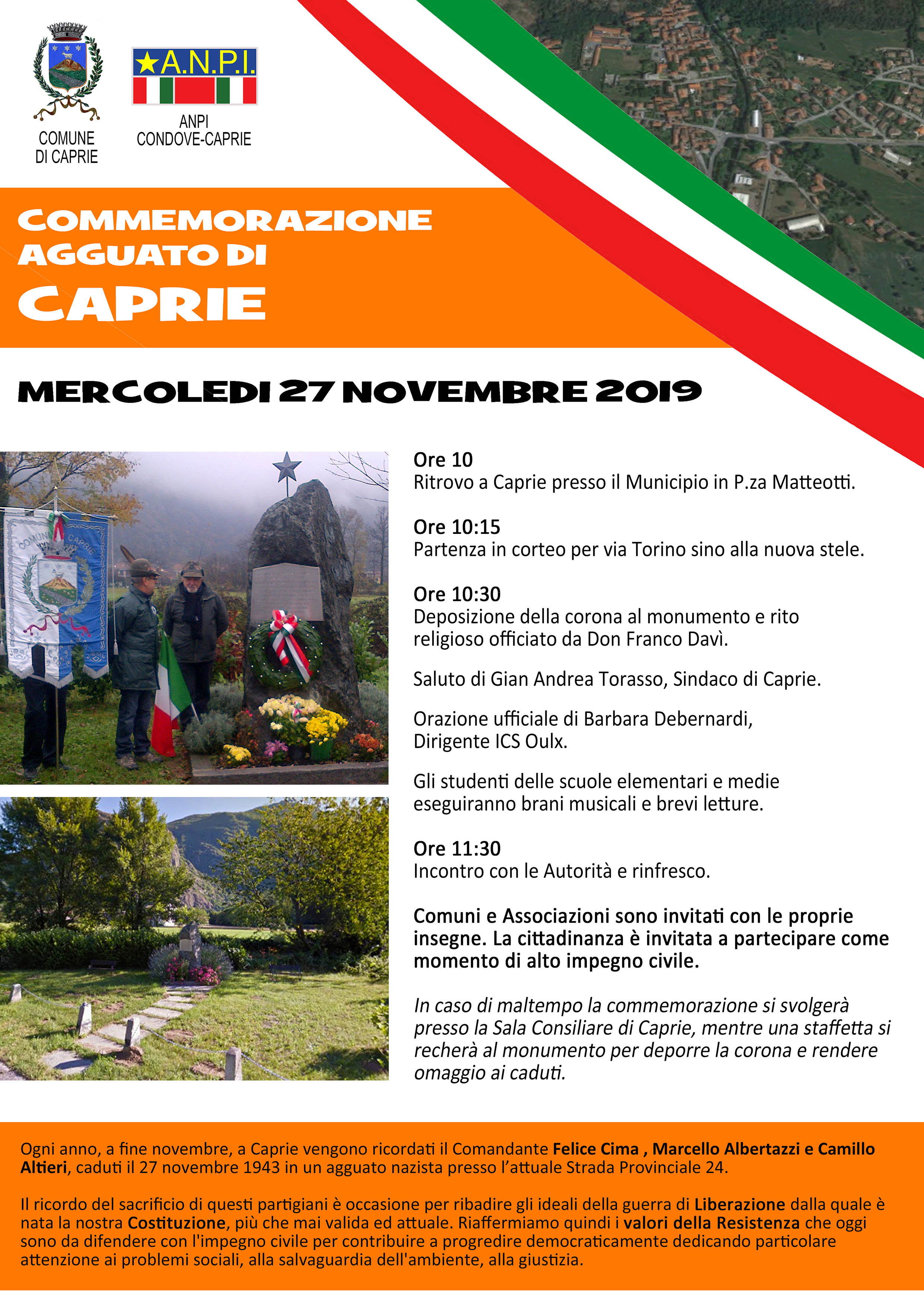 Mercoledì 27 novembre 2019, a Caprie, verranno anche quest'anno ricordati i partigiani Felice Cima, Marcello Albertazzi e Camillo Altieri caduti combattendo per la Liberazione dell'Italia dal regime nazi-fascista.
