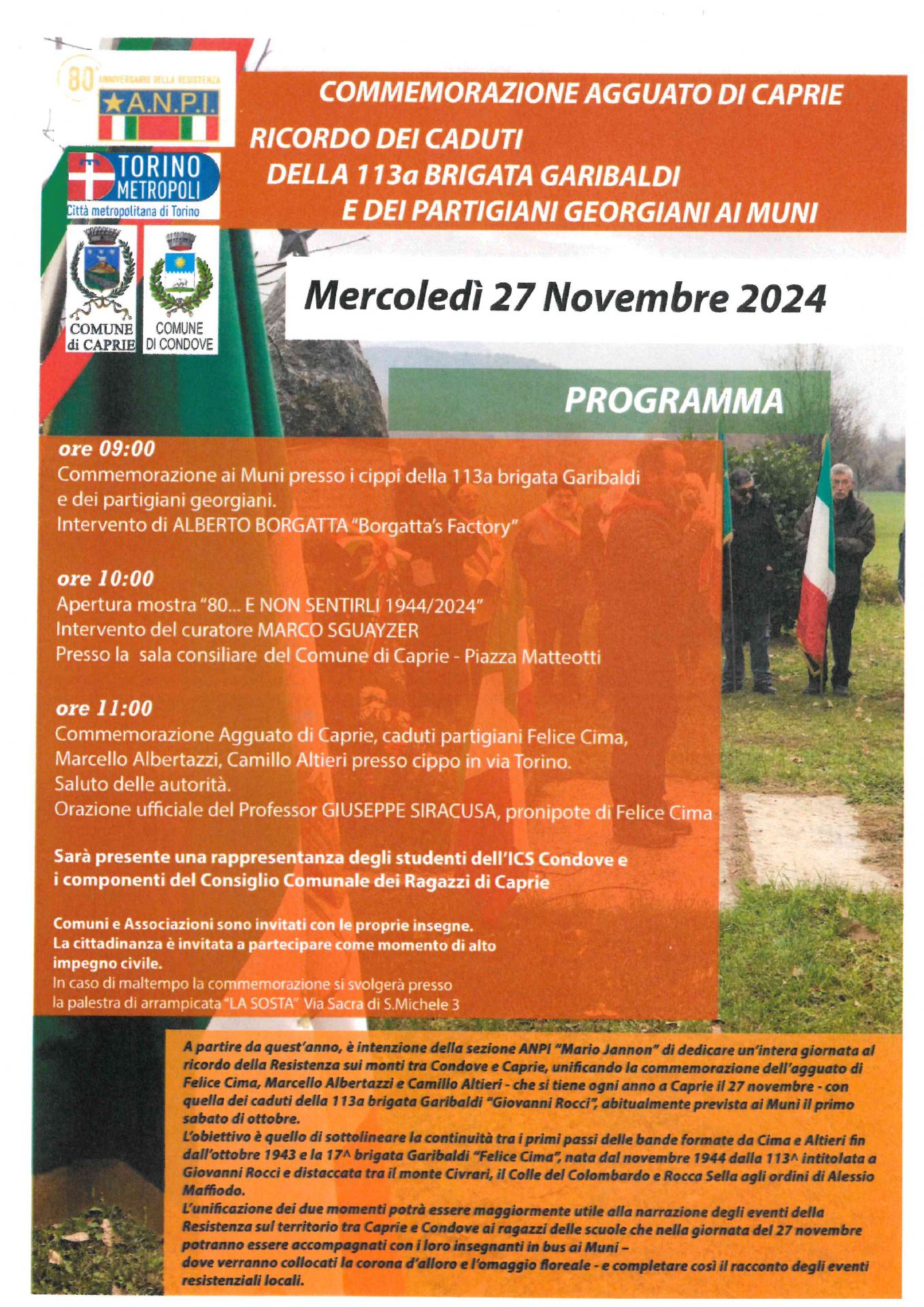 Anche quest'anno a Caprie verranno ricordati i partigiani Felice Cima, Marcello Albertazzi e Camillo Altieri caduti combattendo per la Liberazione dell'Italia dal regime nazi-fascista.