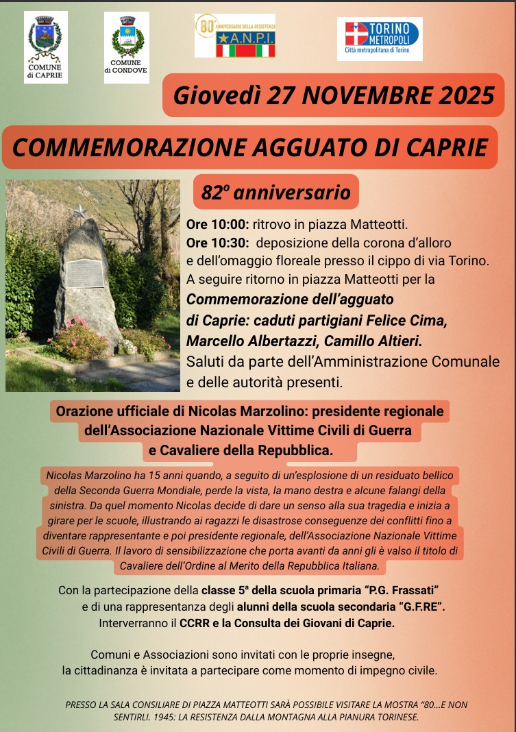 Anche quest'anno a Caprie verranno ricordati i partigiani Felice Cima, Marcello Albertazzi e Camillo Altieri caduti combattendo per la Liberazione dell'Italia dal regime nazi-fascista.