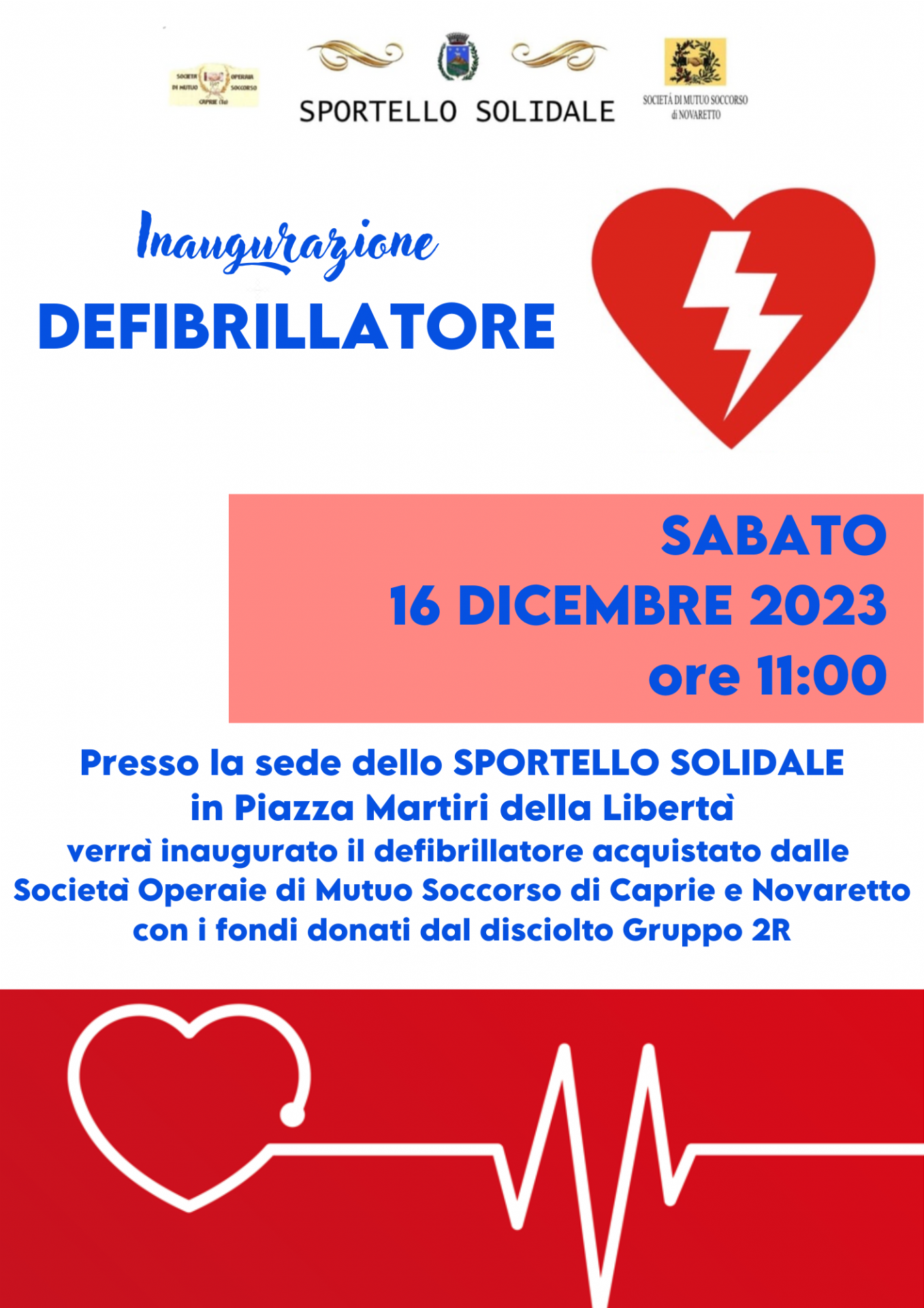 verrà inaugurato il nuovo defibrillatore acquistato dalle Socità Operarie di Mutuo Soccorso di Caprie e Novaretto con i fondi donati dal disciolto Gruppo 2R
