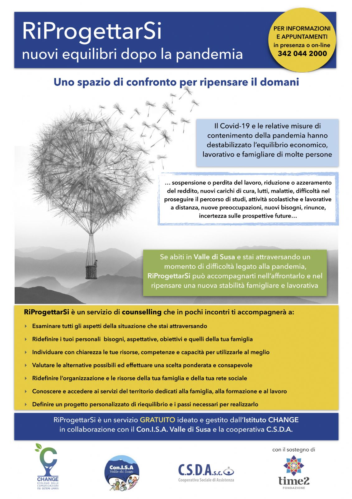 Il servizio di counselling è completamente gratuito, a favore dei cittadini residenti in Valle di Susa. Accompagna le persone e le famiglie destabilizzate dal Covid-19 a riprogettare un nuovo equilibrio economico, famigliare, lavorativo.