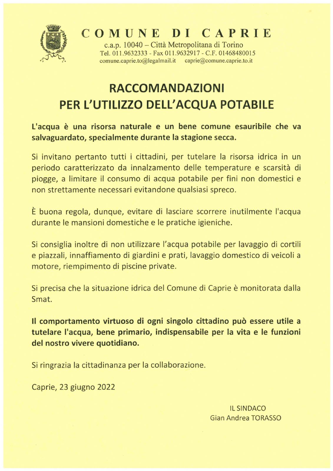 - RACCOMANDAZIONI PER L' UTILIZZO DELL' ACQUA POTABILE[.pdf 371,82 Kb - 23/06/2022]