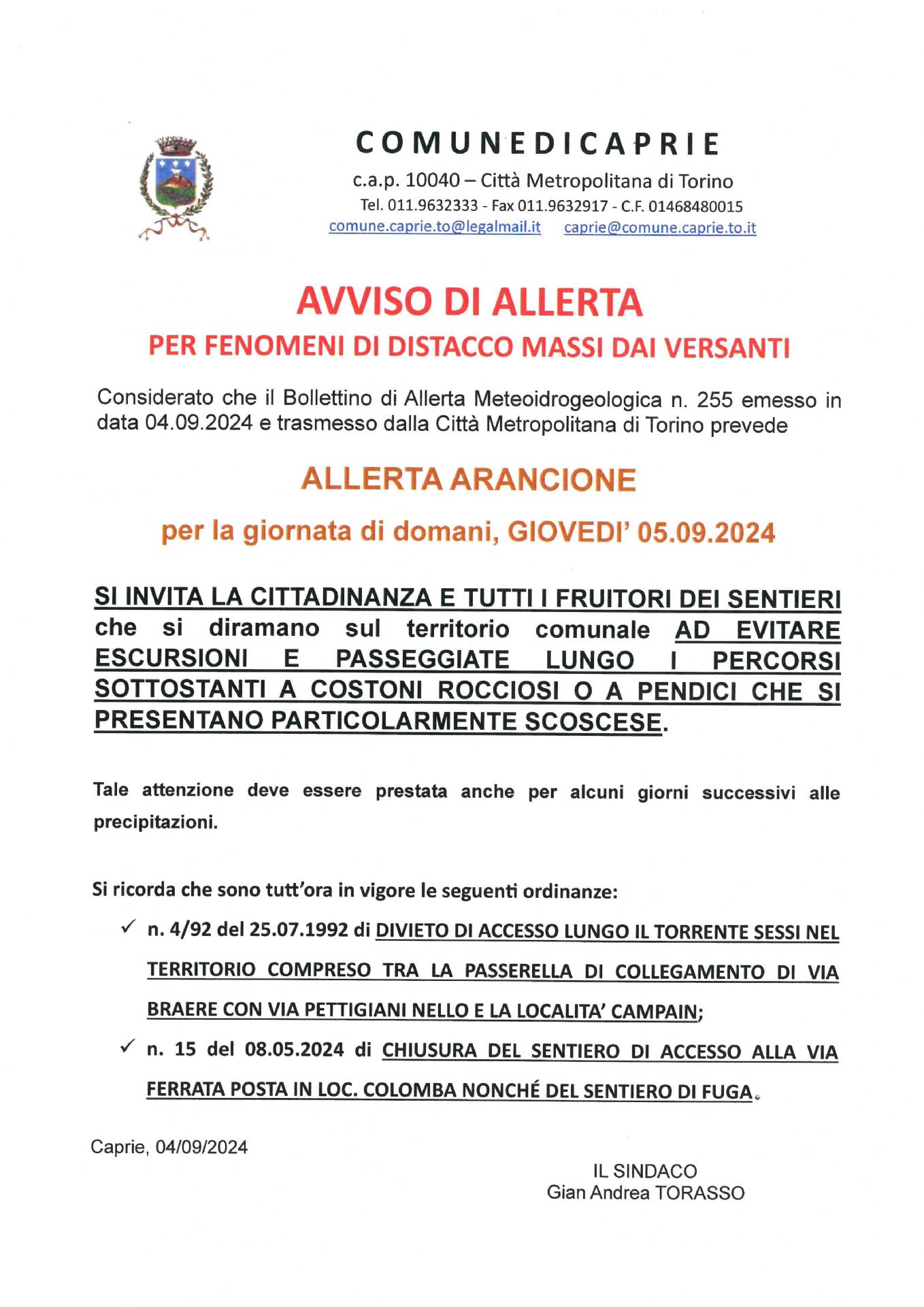 Considerato che il Bollettino di Allerta Meteoidrogeologica n. 255 emesso in data 04.09.2024 e trasmesso dalla Città Metropolitana di Torino prevede