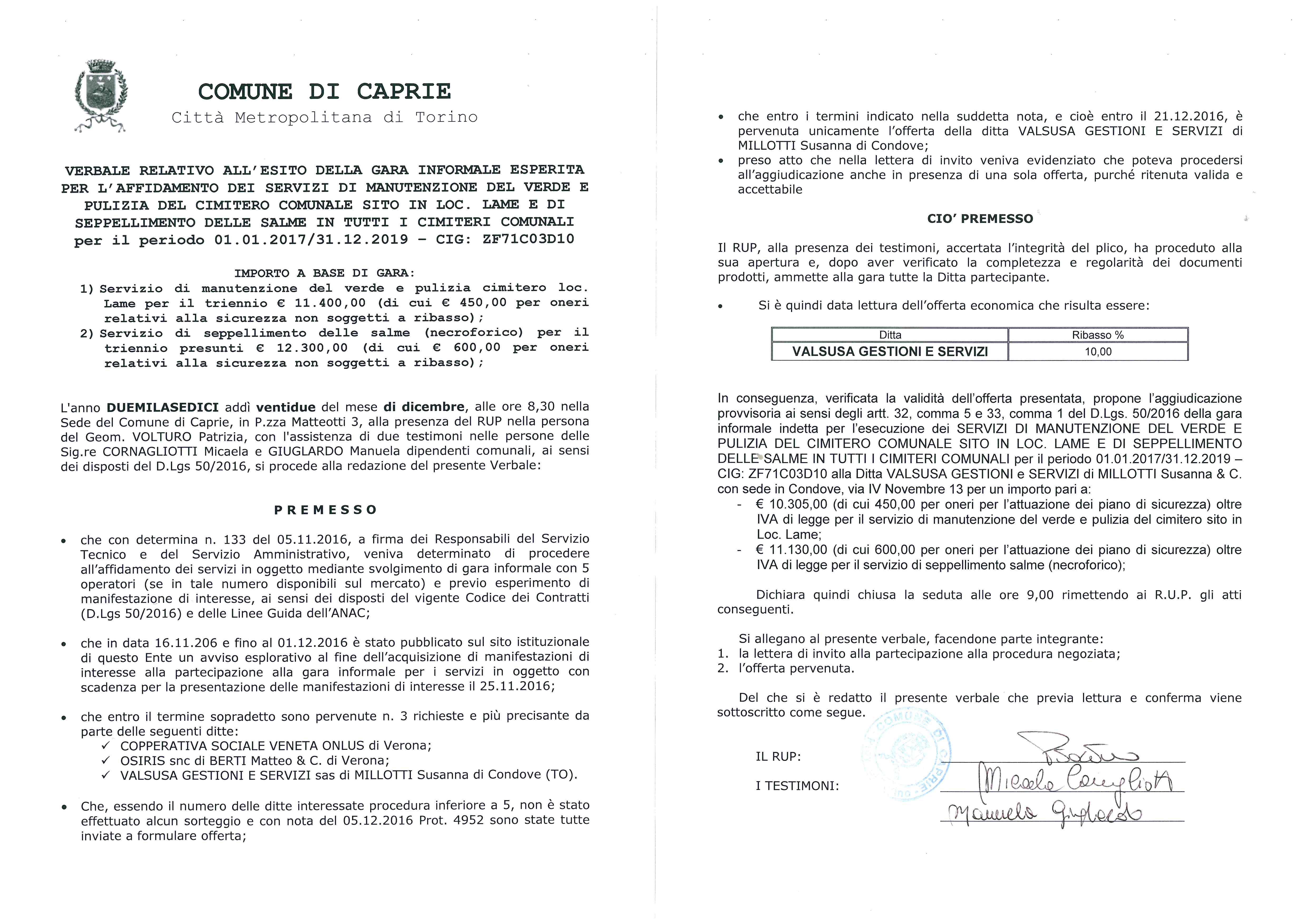 verbale esito di gara informale per servizi di manutenzione del verde, pulizia e di seppellimento salme