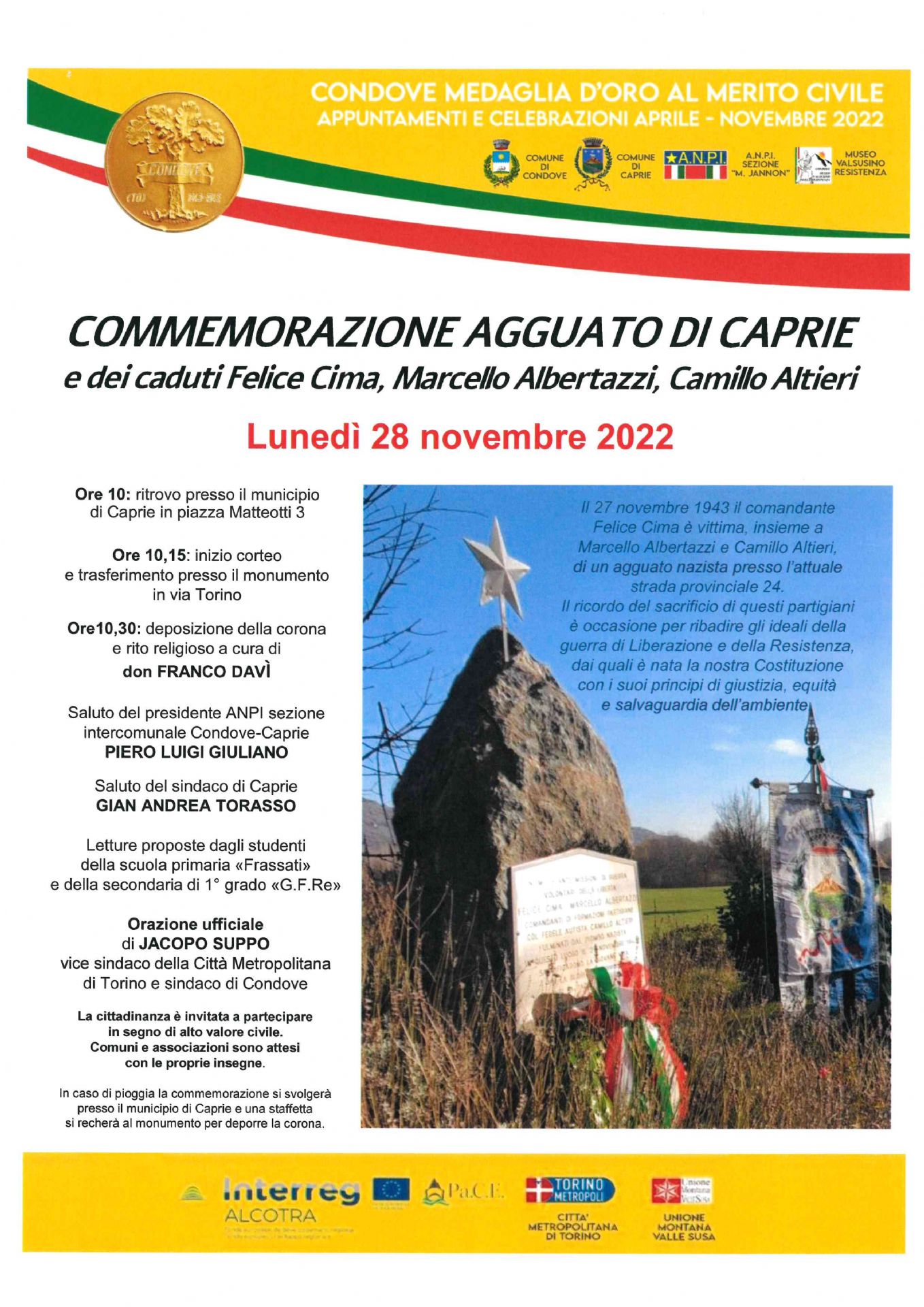 a Caprie, verranno anche quest'anno ricordati i partigiani Felice Cima, Marcello Albertazzi e Camillo Altieri caduti combattendo per la Liberazione dell'Italia dal regime nazi-fascista.