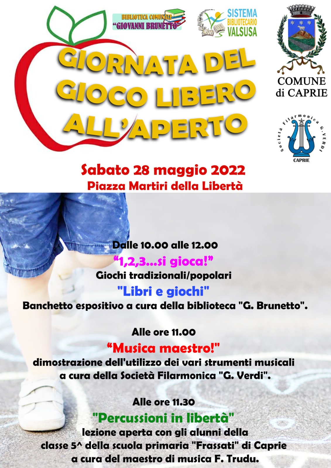 Il Comune di Caprie ha aderito all'iniziativa proposta dalla Regione Piemonte, il 28 maggio p.v. si svolgerà la prima edizione della GIORNATA DEL GIOCO LIBERO ALL'APERTO.