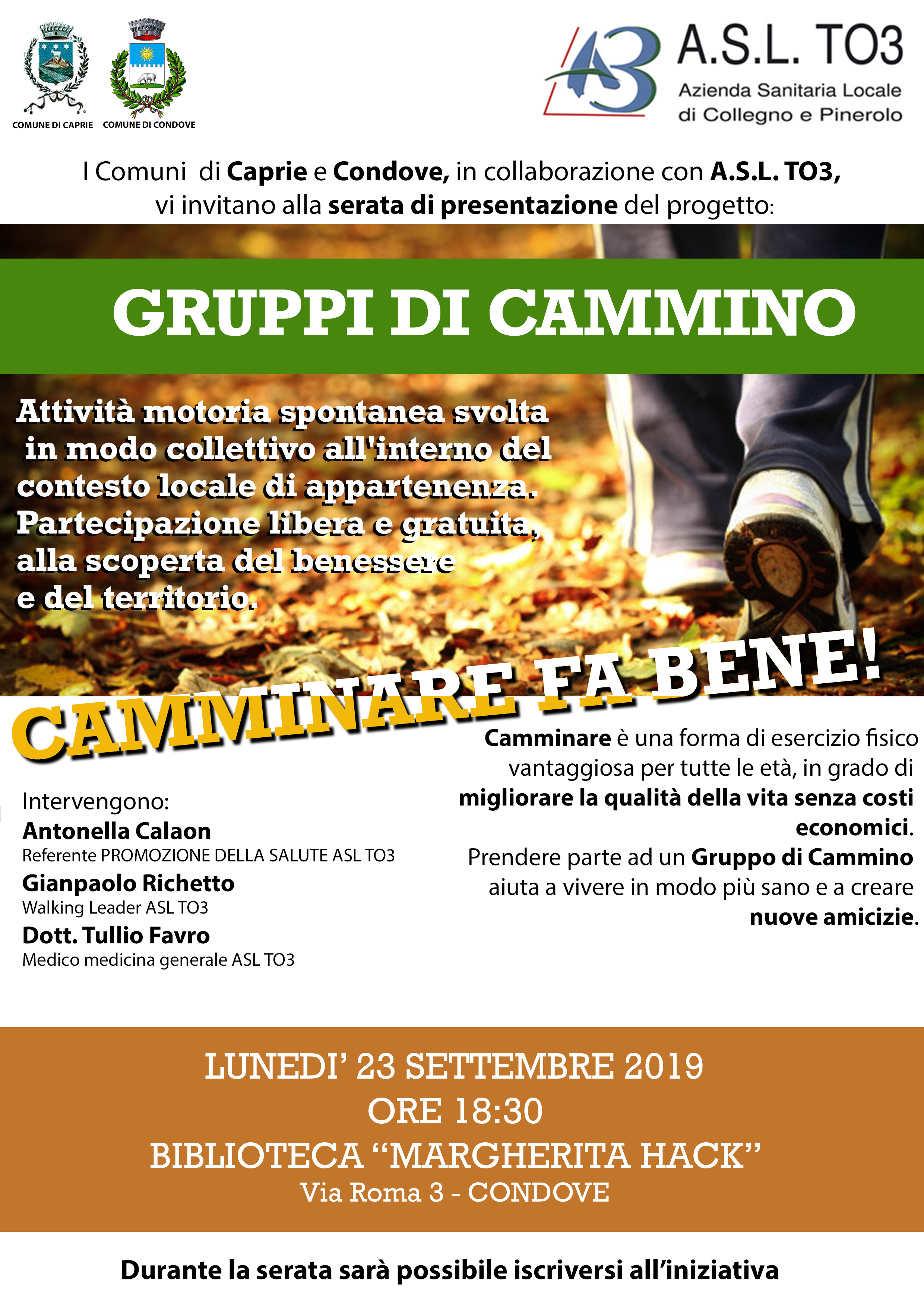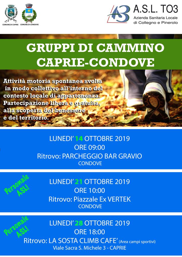 I comuni di Caprie e Condove, in collaborazione con A.S.L. TO3, vi invitano alla serata di presentazione del progetto GRUPPI DI CAMMINO, attività motoria spontanea svolta in modo collettivo all'interno del contesto locale di appartenenza.