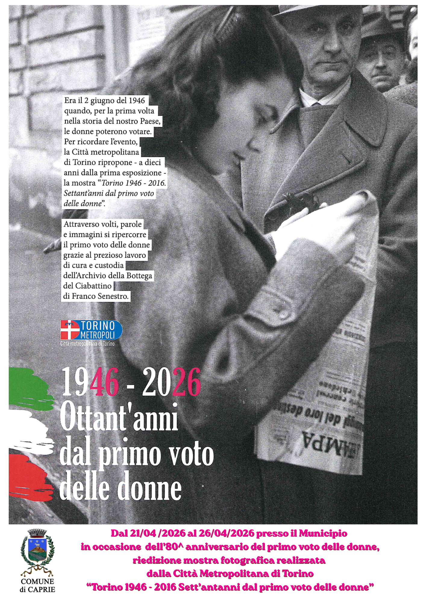 Dal 21.04.2026 al 26.04.2026 inoltre presso il Municipio sarà possibile visitare la mostra fotografica realizzata dalla Città Metropolitana di Torino in occasione dell'80^ anniversario del primo voto delle donne.