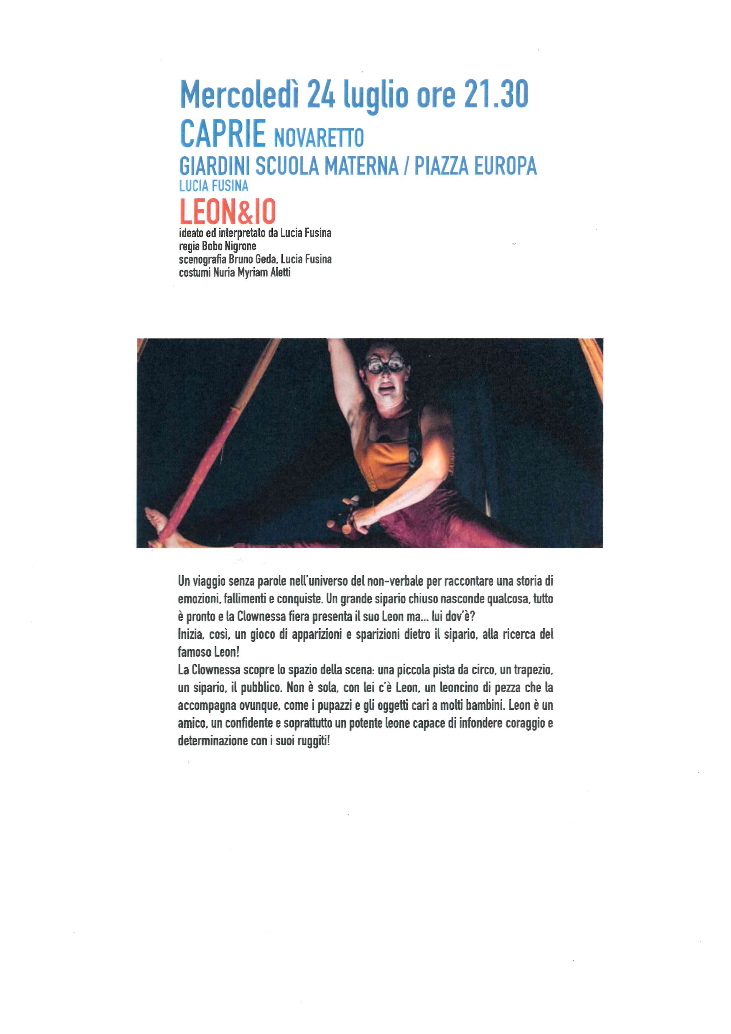 La Clownessa scopre lo spazio della scena: una piccola pista da circo, un trapezio, un sipario, il pubblico. Non è sola, con lei c’è Leon, un leoncino di pezza che la accompagna ovunque, come i pupazzi e gli oggetti cari a molti bambini. Leon è un amico, un confidente e soprattutto un potente leone capace di infondere coraggio e determinazione con i suoi ruggiti!